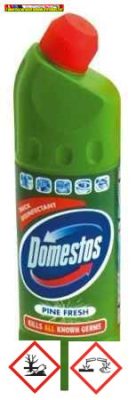 Használat előtt olvassa el, használat közben pedig tartsa be a termék használati útmutatóját és a figyelmeztetéseket. VESZÉLY Domestos Extended Power Sűrű, fertőtlenítő hatású tisztítószer Pine Fresh. FIGYELEM! Tilos más termékekkel együtt használni. Veszélyes gázok (klór) szabadulhatnak fel. Súlyos égési sérülést és szemkárosodást okoz. Nagyon mérgező a vízi élővilágra. Fémekre korrozív hatású lehet. Gyermekektől elzárva tartandó. Az eredeti edényben tartandó. Kerülni kell az anyagnak a környezetbe való kijutását. Védőkesztyű/védőruha/szemvédő/arcvédő használata kötelező. HA BŐRRE (vagy hajra) KERÜL: Az összes szennyezett ruhadarabot azonnal le kell vetni. A bőrt le kell öblíteni vízzel/zuhanyozás. SZEMBE KERÜLÉS ESETÉN: Óvatos öblítés vízzel több percen keresztül. Adott esetben kontaktlencsék eltávolítása, ha könnyen megoldható. Az öblítés folytatása. Azonnal forduljon TOXIKOLÓGIAI KÖZPONTHOZ/orvoshoz. A kiömlött anyagot össze kell gyűjteni. Az edény elhelyezése hulladékként: kiürülést követően a helyi hulladékkezelési előírásoknak megfelelően. TARTALMAZ: nátrium-hipokloritot, nátrium-hidroxidot, Cocamine oxide-ot. FIGYELEM! Ne használja zománcozott vagy magas fényű fémfelületeken (króm/arany). Ne használja hígítás nélkül a padlókon. Ne használja gyapjú, selyem, színes textil, műszálas, bőr vagy olyan ruhaanyagokhoz, melyek speciális bevonatot tartalmaznak (pl. lángálló bevonat). Mindig olvassa el a ruhanemű kezelési útmutatóját. Ügyeljen, hogy a szer ne ömöljön ruhára, bútorokra, szőnyegekre, mert károsíthatja azokat. Ha kiömlött, mindig törölje fel és alaposan öblítse le tiszta vízzel. Használat után mosson kezet. A készítményt eredeti csomagolásban, fénytől védve, száraz, hűvös helyen, élelmiszerektől elkülönítve kell tárolni. A hatásidő letelte után a szer maradványait a kezelt felületekről alapos ivóvizes öblítéssel el kell távolítani, élelmiszerekkel közvetlenül érintkező felületek esetében az öblítés hatékonyságát ellenőrizni kell. A rendeltetésszerű felhasználás során ügyelni kell arra, hogy az élelmiszerek sem a szerrel, sem annak maradékával vagy hulladékával ne kerüljenek érintkezésbe, ill. azokkal ne szennyeződjenek. A termékkel szennyezett élelmiszerek vagy italok emberi fogyasztásra nem használhatók fel. Belélegzés esetén az érintett személyt friss levegőre kell vinni. Amennyiben öntudatlan, azonnal forduljon orvoshoz. Lenyelés esetén forduljon toxikológiai központhoz vagy orvoshoz. Öblítse ki vízzel a szájat. Kevés vizet kell itatni. Ne hánytasson!