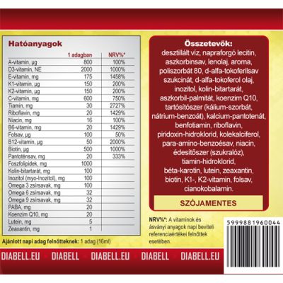 Cukorbetegeknél megfigyelhető a fokozott látásromlás, sőt vakság is előfordulhat. Ezért a DIABELL Multivitaminban a szemvédő vitaminokat is megtalálhatjuk: