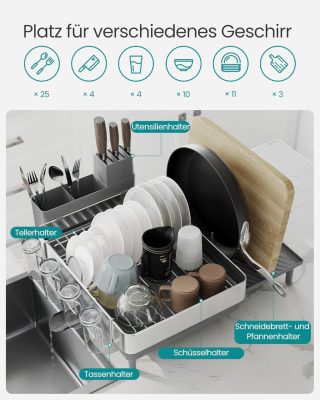 Optimalizálja konyhai helyét: Fedezze fel a tökéletes megoldást egy rendezett konyhához ezzel a SONGMICS edényszárító állvánnyal. Akár 11 álló tányért, 10 tálat és 4 csészét is képes befogadni. Ez az edényszárító vágódeszkát és edénytartót, valamint egy evőeszköztartót is tartalmaz, amelyben kanalak, villák, kések és egyebek számára nyílások vannak. Rendszerezi a konyhai kellékeit, és több pultfelületet biztosít a könnyű főzéshez és étkezések előkészítéséhez.