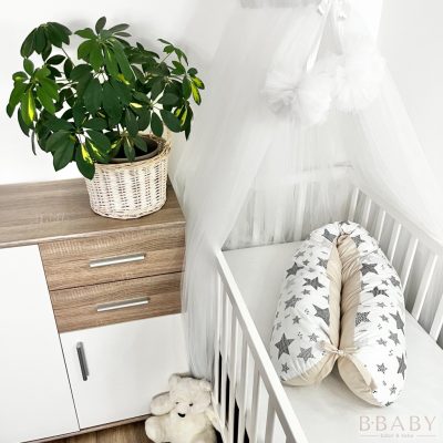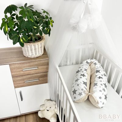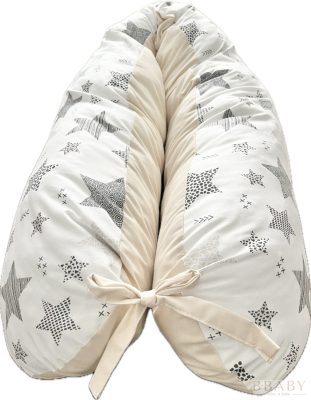 A Dove Grey kismamapárna nem csupán praktikus segítőtárs a várandósság és a baba szoptatása idején, de stílusos választás is. Az egyik oldala letisztult bézs, míg a másik fehér alapon nagy szürke és fekete csillagokkal díszített – így bármikor az aktuális hangulatodhoz vagy a babaszoba dekorációjához igazíthatod a megjelenését.