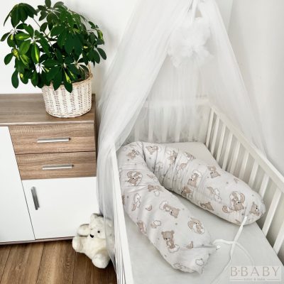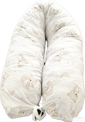 A Szivárványos Maci kismamapárna ötvözi a természetes, békés színeket és a játékosságot: meleg bézs alapszínét vidám, szivárványos alvó macik díszítik, így harmonikusan illeszkedik minden babaszobába. Ez a különleges párna nemcsak megjelenésében kedves, hanem ergonómiai szempontból is hasznos segítőtárs a kismama és kisbabája számára.