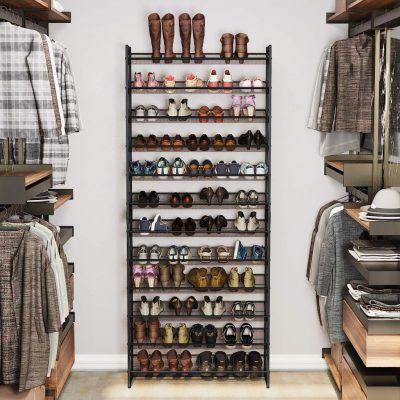 Ebben a 12 szintes cipőtartóban minden cipőjét tárolhatja anélkül, hogy sok helyet pazarolna a padlón.A polcok közötti 18,5 cm-es távolságnak köszönhetően ez a cipőtartó elegendő helyet biztosít edzőcipőinek, magassarkúinak és még csizmáinak is.Minden polc akár 10 kg súlyt és 5 pár női cipőt vagy 4 pár férfi cipőt is elbír.Az állítható lábak nagyobb stabilitást biztosítanak a polcnak, és egyben védik a padlót a karcolásoktól.