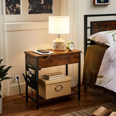 Oldalsó asztal Összecsukható éjjeliszekrény aljzatokkal Összecsukható asztallap polccal és szövettáskával nappaliba Hálószobába Vintage barna fekete: