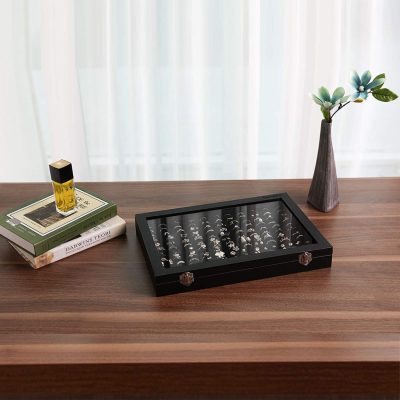 ékszerdoboz üvegtetővel, gyűrűknek, fülbevalóknak, mandzsettagomboknak, gyűrűtároló doboz, akár 100 gyűrű tárolására alkalmas, vitrin, fekete JDS301