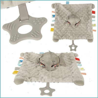 Puha elefántos szundikendő - színes címkékkel, csengettyűvel és rágókával. Ez az elefánt minden kisgyermek legjobb barátja lehet.
