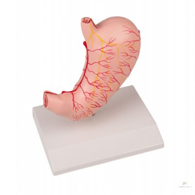Ez az életnagyságú modell a mediális sík mentén boncolható, és felnyitható, hogy megmutassa a gyomor belső szerkezetét, beleértve a cardiát, a nyálkahártyát és a pylorust. A modell az ereket is mutatja. Állványra szerelve.