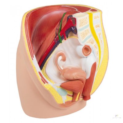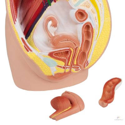 Ez az életnagyságú modell medián sagittális metszetű, és a női medencét 3 részre osztva mutatja be. A hasi izmokon és ereken kívül különösen az urogenitális szerveket ábrázolja. Kivehető a méh, a hüvely és a húgyhólyag egyik fele, valamint a bél egyik fele a végbéllel együtt.
