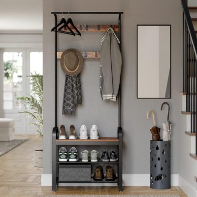 • 4 az 1-ben kabáttartó: Ez a bejárati tárolóegység egy akasztósínt, egy cipőpadot, egy cipőtartót és kabátakasztókat kombinál, hogy megfeleljen az Ön különféle igényeinek – a ruhák felakasztásától, a cipők rendszerezésétől és a kényelmes üléstől a cipő cseréig.