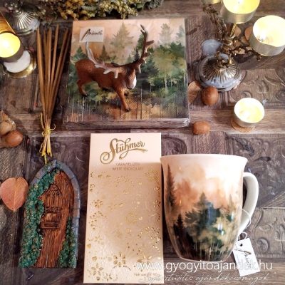 Az ajándékcsomag minden darabja az erdő békéjét hordozza – ideális ajándék természetkedvelőknek, gyerekeknek és spirituális lelkeknek, akik hisznek a láthatatlan világ varázsában, rajonganak az erdő titkaiért, a túrázásért, erdőfürdőért.