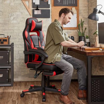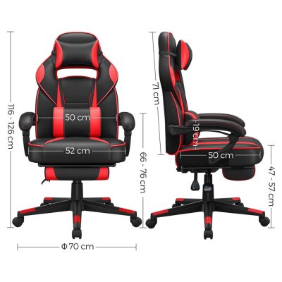 Racing-Gamer szék, állítható irodai szék lábtartóval, ergonomikus kialakítás, billenési mechanizmus, fejtámla, deréktámasz, 150 kg teherbírás, fekete-piros