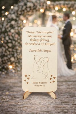 Tedd még meghittebbé a szülőköszöntés pillanatát egy különleges, gravírozott ajándékkal édesanyád számára. Ez a személyes üzenettel készült tábla menyasszonytól anyának szól, és tökéletesen kifejezi a szeretetet, hálát és kötődést. A gravírozott fa ajándék nemcsak gyönyörű dekoráció, hanem örök emlék is marad. Egyedi névvel, dátummal és személyes üzenettel rendelhető, így igazán különlegessé teszi az esküvői szülőköszöntést.