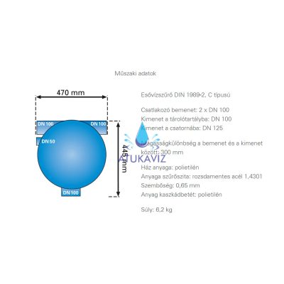 Esővízszűrő esőtároló tartályokba vagy azokra szerelhető. Ennél a változatnál a tárolóba való kivezetés lefelé megy.