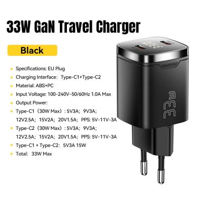 • ESSAGER® ES-CD45 - 33W USB-s fali gyorstöltő LED kijelzővel - 2x Type-C: Android, Apple és Windows rendszerekhez