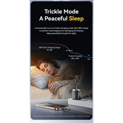 4. Akkumulátorkímélő üzemmód: A "Trickle Charging" (csepptöltés) funkció megvédi az eszközeid akkumulátorát a túltöltéstől. Amikor a készüléked eléri a 80%-os töltöttséget, az ESSAGER intelligensen visszavesz a tempóból, hogy meghosszabbítsa az akku élettartamát.