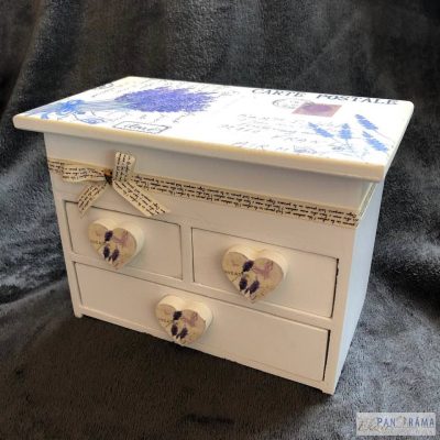 Levendula mintás fa ékszertartó ládika, tetejében tükörrel, az alsó része 3 fiókra osztott!