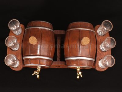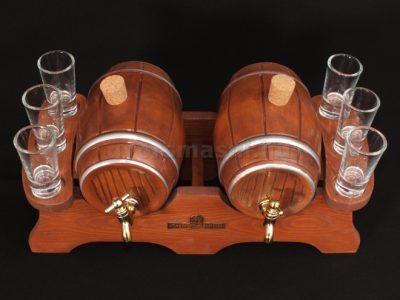 • Fa pálinkás készlet 2 kerámia hordó 6 pohár barna színben