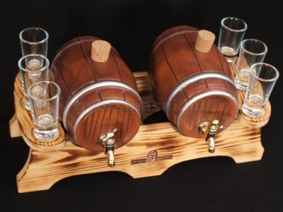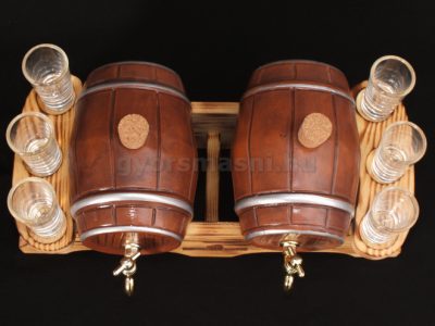 • Fa pálinkás készlet 2 kerámia hordó 6 pohár égetett minta