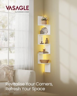 • Stílusos tárolás és bemutatás:Az 5 szintes lebegő sarokpolc bőséges helyet biztosít napi használatú tárgyaid tárolására és kiállítására, miközben a zigzag formatervezés fokozza otthonod vizuális vonzerejét.
