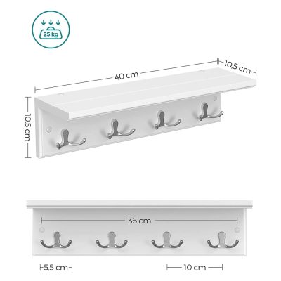 • [2 az 1-ben kialakítás] Kabáttartó és polc egyben – kabátok, táskák, sálak és sapkák a 4 dupla kampón, pénztárcák és kulcsok a polcon.A bemélyedésnek köszönhetően a képkeretek vagy dekoratív képek stabilan elhelyezhetők a polcon