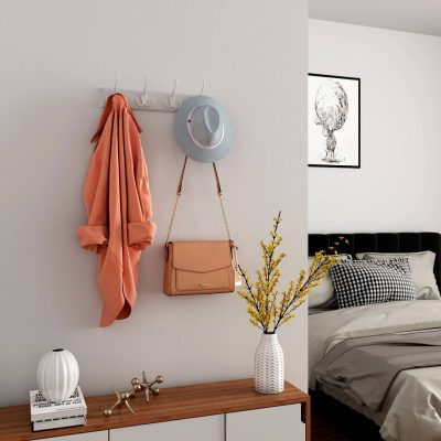 • Amit kapsz: falra szerelhető ruhafogas 4 három kampóval, hogy elrendezd az ajtón kívüli legfontosabb dolgokat egy barátságosabb bejárathoz, amely alapterületet takarít meg