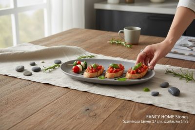 FANCY HOME Stones Szervírozó tányér, 17 cm, szürke, kerámiaA FANCY HOME Stones Szervírozó tányér elegáns és praktikus választás minden otthon számára. A 17 cm-es átmérőjű tányér tökéletes különféle kisebb adagok, például előételek, desszertek vagy tapas felszolgálásához. A kiváló minőségű kerámiából készült tányér nemcsak esztétikus, hanem tartós és ellenálló is, így hosszú távú használatra alkalmas. Az egyedi formatervezés és a minőségi máz modern és elegáns megjelenést biztosít, amely bármilyen asztali környezetben jól mutat.Főbb jellemzők: Anyag: Prémium minőségű kerámia Átmérő: 17 cm Kialakítás: Egyedi formatervezés minőségi mázzal bevonva Tartósság: Erős és ellenálló kerámia anyag Mosogatógépben mosható: Igen Garancia: 3 évMit tennék bele: Előételek: Bruschetta, mini quiche, sajt és olívabogyó tál. Desszertek: Csokoládé mousse, tiramisu, gyümölcstál. Tapas: Serrano sonka, chorizo, padron paprika. Saláták: Kis adag cézár saláta, görög saláta, caprese saláta. Egyéb: Sushi, sashimi, maki tekercsek.Ideális felhasználási területek: Mindennapi használat: Tökéletes választás a napi étkezésekhez otthon vagy az irodában. Különleges alkalmak: Modern megjelenése miatt ideális ünnepi asztalterítékhez és különleges eseményekre. Vendéglátás: Éttermek, kávézók és bárok számára is kiváló választás.