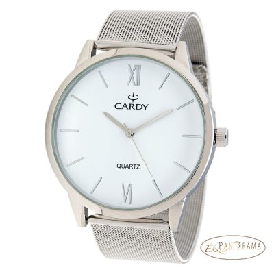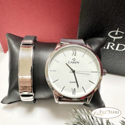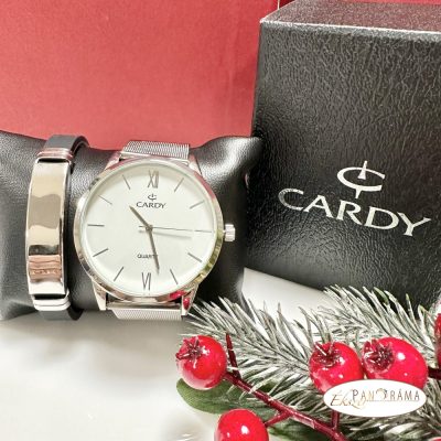 Igényes Cardy óra, ezüst színű tokkal, fém szíjjal, mellé órakísérő karkötő , kaucsuk szíjjal, acél díszítéssel díszdobozban!