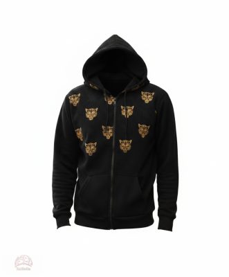 Egyedi Dizájn: Különleges, arany színű tigrisfej motívumokkal díszített kapucni.