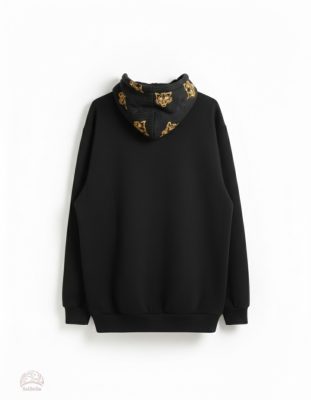Emeld új szintre az utcai viseletedet ezzel az exkluzív megjelenésű, fekete kapucnis felsővel. A minimalista alapstílust a kapucni belső részén és felületén elhelyezett, részletgazdag arany tigrisfej mintázat teszi egyedivé. A vízszintes textúrájú szövet és a fémes hatású grafika találkozása modern és magabiztos stílust kölcsönöz viselőjének.