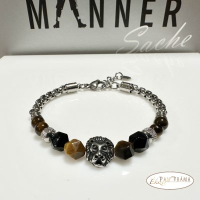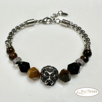 Nemesacél karkötő, tigrisszem, ónix ásványokkal, közepén egy acél oroszlán fejjel
