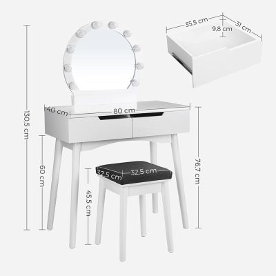 fésülködőasztal világítással, fésülködő asztal tükörrel és izzókkal, kozmetikai asztal, fésülködő asztal, a tökéletes sminkért, párnázott szék, 2 nagy fiók, fehér