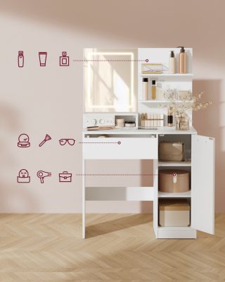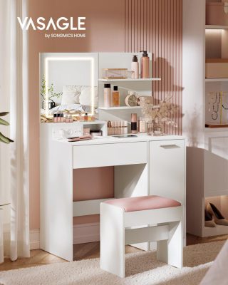 VASAGLE Kailyn kollekciós fésülködőasztal LED-es tükörrel és elosztóval, kozmetikai asztal, fiókkal és nyitott polcokkal, szekrénnyel 2 állítható polccal, fehér