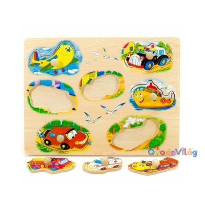 A puzzle táblán láthatóak járművek színes ábrái, így könnyen be tudja azonosítani gyermeke a puzzle helyét.1-3 éves korig.