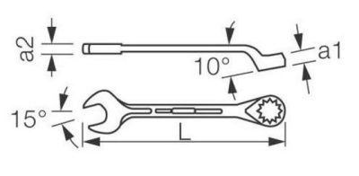 Lapos, hajlított csillag-villáskulcs, vékony kivitelű, vékony falú és erős.
