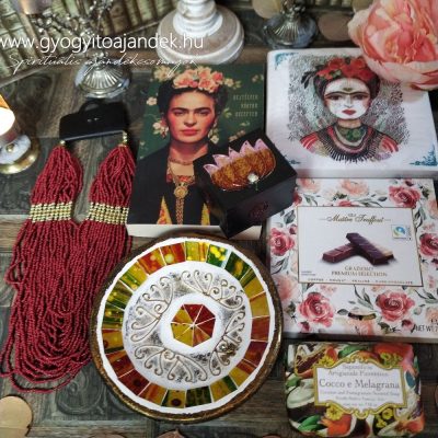 Frida Kahlo ajándékcsomag egy különleges hölgynek szól egy különleges hölgytől. Frida mexikói művésznő volt, egyedi világnézetével és zseniális alkotásaival, festményeivel a 20. század egyik legjelentősebb asszonya, a popkultúra kiemelkedő alakja. Ikonikus alakja egybeolvadt a lázadással, a nőiességgel, az egyediség fogalmával. "Merj élni, meghalni bárki tud" - mondta, és milyen igaza volt! Frida sok szenvedélye és "hobbija" közül talán az egyik legkevésbé ismert az ételek iránti lelkesedése. A legendás festőnő gyakran adott férjével közös házában lakomákat, ahol a saját maga készítette specialitásokkal, ételekkel és a italokkal nyűgözte le vacsoravendégeit. Ebben az ajándékcsomagban megtaláljátok Frida füveskönyvét, mely nem csak egyszerű recept könyv. Sokkal mélyebb, az életében nagyon hamar bekövetkezett drámai fordulathoz kötődő napló, egy dokumentum, mely a Halállal köttetett egyezségének állít emléket.