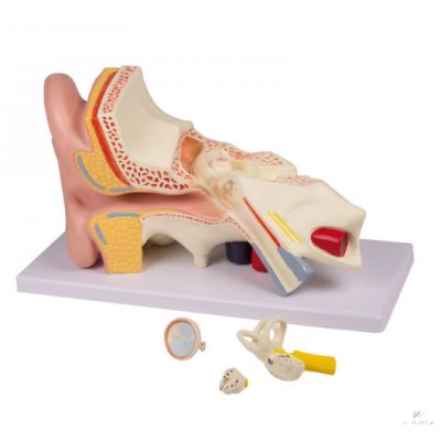 Ez a kissé megnagyobbított, minden anatómiai részletet részletesen reprodukáló emberi fülmodell a hallójáratot, a dobhártyát, a fülkagylót, az inkuszt, a kengyelcsontot és a csigahártyát mutatja be. Láthatóak a környező csontos struktúrák, valamint az izom- és porcszövetek. Tökéletes modell asztali használatra.