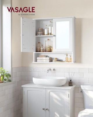 • [Állítható magasságú polc] Az ajtók mögött van egy polc, amely 3 magassági lehetőséget kínál. Különböző magasságú fürdőszobai kellékei mind otthonra találhatnak itt