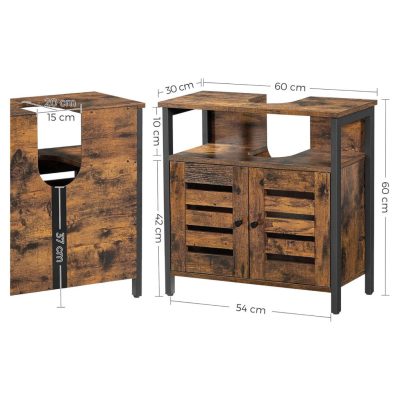 Mosogató alatti Szekrény, Fürdőszoba szekrény, Tárolószekrény, 60 x 30 x 60 cm, acél kerettel, zsalugáteres ajtókkal, állítható deszkával, rusztikus barna és fekete: