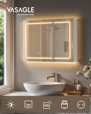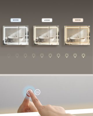Kailyn kollekció fürdőszobai faliszekrény tükörrel, LED világítással, többaljzattal, páramentesítő funkcióval, 10x nagyító tükörrel, modern stílusban, 16,5 x 80 x 60 cm, fehér
