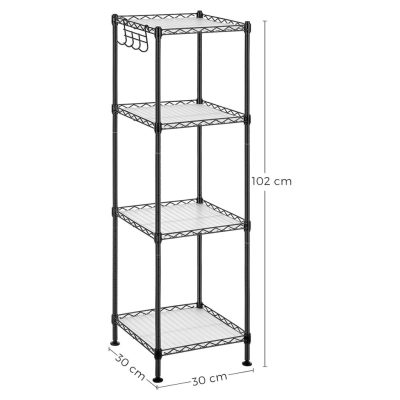 Fürdőszobai polc, 4 szintes fémhuzalpolc, fém tároló állvány, teljes terhelhetőség 80 kg, 4 PP lappal, kivehető kampókkal, 30 x 30 x 102 cm kis helyhez, fekete: