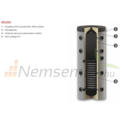 Fűtési keskeny puffer tártály - 1 hőcserélővel hőszigetelt 150 literes tartály melegvíz tárolás céljára. Sunsystem PS1 150