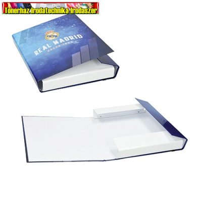 A Real Madrid címerével díszített füzetboxMéret: A/4Anyaga: kartonGumis záródással