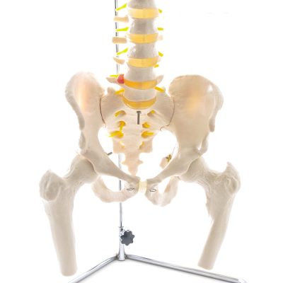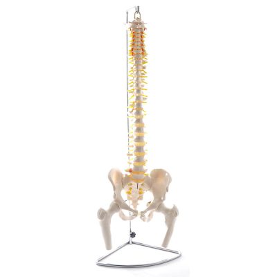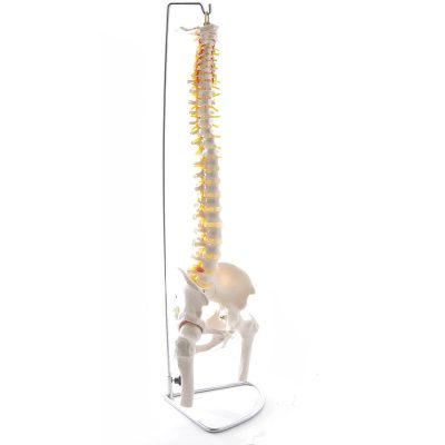 Ez a gerincoszlop modell egy valódi emberi gerincről készült, és élethűen mutatja be a gerincoszlop szerkezetét. Az ágyéki régióban egy porckorongsérv látható, és a combcsontfejek mozgathatók. A gerincoszlop-modell egy fémkeret segítségével a levegőbe függeszthető.
