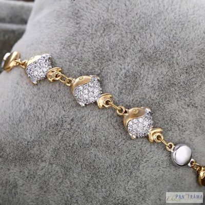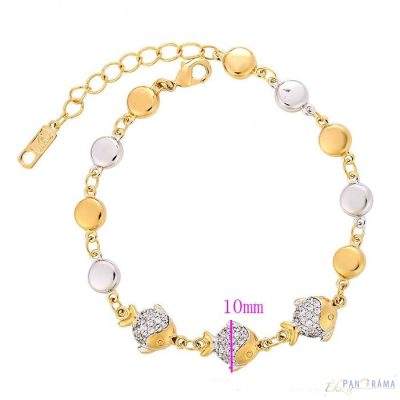 Gold Filled antiallergén karkötő, fehér és arany színű szemek váltakoznak, középen 3 db hal motívummal, amik pici cirkónia kristállyal vannak díszítve!