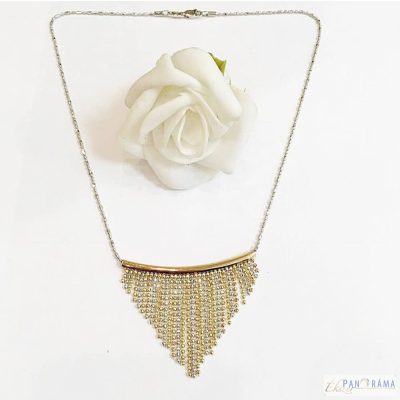 Mutatós, egyben visszafogott különleges két szín arany és ezüst kombinációjával készült nyaklánc! A hossza 44 cm, a lelógó háromszög alakú betét 3,5 cm.