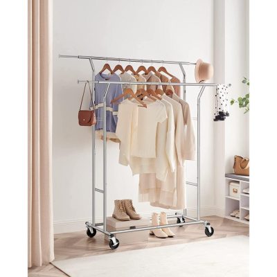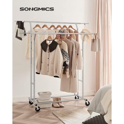 VASHOME/SONGMICS nagy teherbírású fém ruhatartó állvány 110 kg nagy teherbírású ruhatartó kerekeken hossz 129-169 cm króm