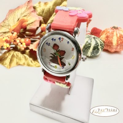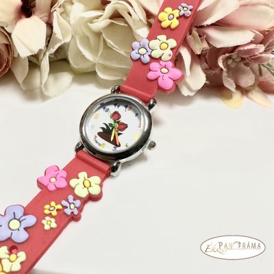 Gyerek karóra, 3D virágokkal , piros szilikon szíjjal.