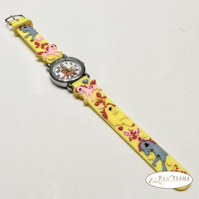 Gyerek karóra, kedves kis állatokkal, sárga szilikon szíjjal.