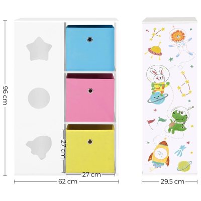 Űrküldetésben: A kis űrhajósai imádni fogják ezt az űrtémájú játékszervezőt. El tudják képzelni, hogy könyveiket egy űrhajóban olvassák, és megtanulják, milyen könnyű megtisztítani a játékaikat.Mindenkit szeretettel várunk: Helyezze el kedvenc könyveit a 3 nyitott polcra, a nagy játékokat a 3 négyzet alakú szövetdobozba (egyenként 27 x 27 x 27 cm), a tetejére pedig a trófeákat. Gyermekei minden kincsüket tárolhatják ebben a csodálatos bútorban.Első a biztonság: A kicsik számára mindennek biztonságosnak kell lennie. Ez az oka annak, hogy ez a gyermekpolc strapabíró forgácslapból készült, és dőlésvédelemmel van felszerelve, amely biztonságos környezetet biztosít számukra, ahol szórakozhatnak.Tárolás és távolság: Hogyan juthatsz el a színes dobozokhoz? Nézd meg jobbról a polcot, nincs válaszfal. A kicsik könnyedén kihúzhatják a fogantyún lévő szövetdobozokat, és gond nélkül visszatolhatják – gyerekjáték.Amit kapsz: A többfunkciós gyermekpolca 3 színes dobozzal, kivágott dizájnnal és űr témával. Tartalmazza az egyértelmű utasításokat és a szerelési tartozékokat az egyszerű összeszerelés érdekében.