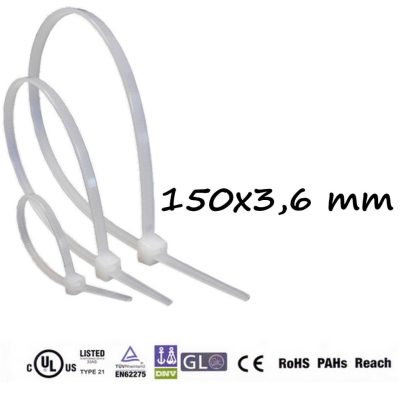 • Méretek: 150 mm hosszú és 3,6 mm széles, ami ideális kisebb és közepes méretű kábelek kötegelésére.