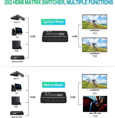HDMI Matrix 2x2, 2 in 2 Out Matrix Switch HDMI Video Switcher Box IR távirányító A 2 in 2 Out HDMI Matrix Switch lehetővé teszi két HDMI-eszköz egyszerű átkapcsolását vagy szétválasztását két HDMI-kompatibilis monitorra vagy projektorra. Alkalmas házimozihoz, villához, konferenciateremhez, bevásárlóközponthoz, videofalhoz, iskolai és vállalati képzési környezethez stb. Műszaki adatok - Terméktípus: HDMI Matrix 2x2. - Interfész típusa: 2 HDMI bemenet, 2 HDMI kimenet - Tápegység: DC 5V Jellemzők - HDMI 2.0b HDCP 2.2 támogatás - 3D videó formátum támogatása - Legnagyobb felbontás 3840*2160/60Hz-ig - 18,5 Gbps 3 adatsebesség és tmds támogatás órajel akár 600Mhz - Támogatja a mély színeket 8/10/12/24/32/48bit - Támogatja a HDMI audiokimeneteket, a 3,5 mm-es fülhallgató-csatlakozót és az optikai kimenetet egyszerre - Támogatja az LPCM/Dolby/DTS 5-öt.